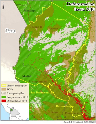 Given the importance of conserving the natural ecosystems in this area, we present an analysis of deforestation in the area known as “North of La Paz” , which is affected by the previously mentioned development strategy and located in the municipalities of San Buenaventura, Ixiamas, and Rurrenabaque. Out of the 4,269,533 ha in this area, 1,093,480 ha are indigenous territories (TCOs), and 926,073 are Protected Areas (APs). There is an overlap of 332,546 ha and therefore 40% of the lands are subject to sustainable management and protection. The rest of the land is under communal, private, or public land titles (typically managed without a sustainable management plan to begin with). In its origins, 79% of this area was covered by forest. By 2010, 124,674 hectares have been lost, equivalent to 4% of the initial forest cover.