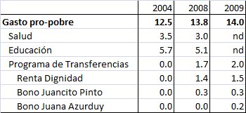 Entre 2004 y 2009 el gasto público ligado a las Metas del Milenio, corriente y de capital, se ha incrementado de Bs. 8.400 millones (12% del PIB) en 2004 a Bs. 17.400 millones (14% del PIB) en 2009. Este último monto incluye los programas de transferencia de efectivo del gobierno que equivalen a 2% del PIB: Renta Dignidad (1,5% del PIB), Bono Juancito Pinto (0.3% del PIB) y Bono Juana Azurduy (0,2% del PIB). Durante estos años, el gasto público social se ha incremento a una tasa de 7% por año en términos reales.