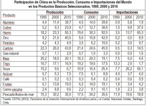 El documento de la CEPAL de 2012, titulado “Panorama de la Inserción Internacional de América Latina y el Caribe”, presenta información que permite analizar el impacto de China sobre el comercio internacional, el que se explicita en la Tabla a seguir: