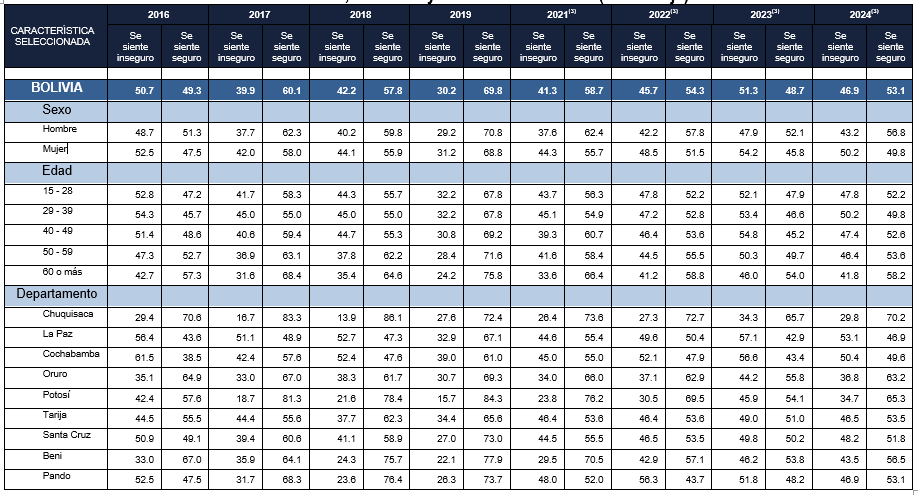 Instituto Nacional de Estadística (INE). (2024). Bolivia: Percepción de seguridad de la población de 15 años o más, al caminar sola(o) cerca de su vivienda cuando es de noche, según característica seleccionada, 2016–2024. https://www.ine.gob.bo/index.php/encuesta-de-hogares-seguridad/