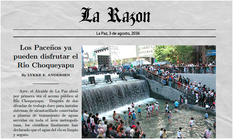 El año 2036 el principal titular del periódico “La Razón” en su sección de Agua y Saneamiento para las ciudades de La Paz y El Alto dice ….