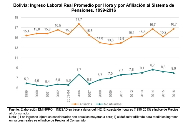 El empleo formal puede ser aproximado por los trabajadores que están afiliados al sistema de pensiones y el informal corresponde entonces a los que no lo están. Bajo esta definición, los ingresos laborales reales por hora –estimados a partir de las Encuestas de Hogares oficiales– presentan una tasa de crecimiento anual menor para la población ocupada formal (0,5%) que para la informal (1,8%) entre el periodo 1999 y 2016.