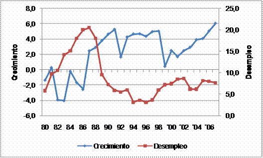 Crecimiento del PIB y Desempleo Urbano, 1980-2007